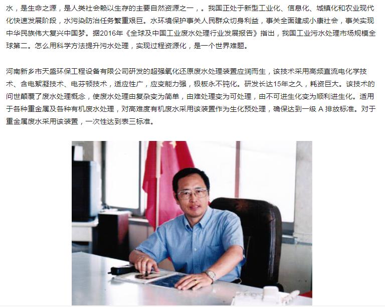 中國高新技術(shù)網(wǎng)發(fā)布:《關(guān)注:解碼科技創(chuàng)新》——新鄉(xiāng)市天盛環(huán)保“超強(qiáng)氧化還原廢水處理技術(shù)”